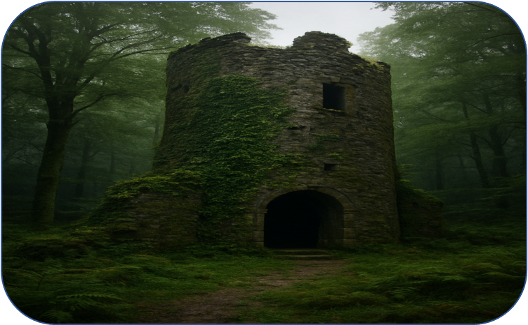 Se acercaron. La piedra era negra, o quizá ennegrecida por el tiempo, con raíces, musgo y líquenes verdosos por doquier, y hiedra que ascendía por la estructura hasta lo alto. No tenía techo; este, al parecer, se había derrumbado con los años. Ya hace mucho.